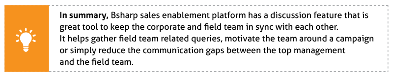 Bsharp’s sales enablement platform hosts a scalable discussion feature. Bsharp’s discussion module had the following features that helped connect the corporate to the field team.