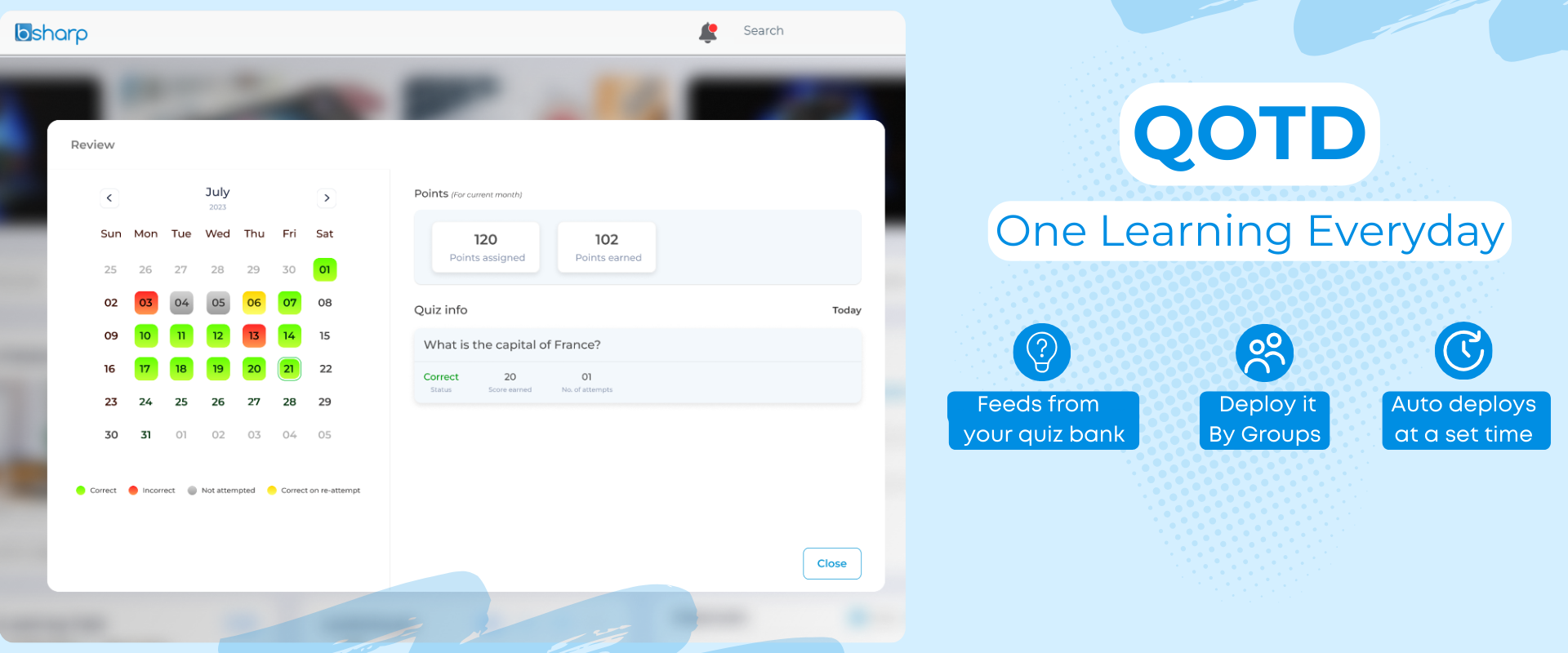 The Quiz of the day feature in Bsharp Learn lets you automatically deploy 1 or 3 questions everyday. Fed automatically at a particular time. These questions are created by pulling questions from a question bank or created afresh to reinforce a topic.