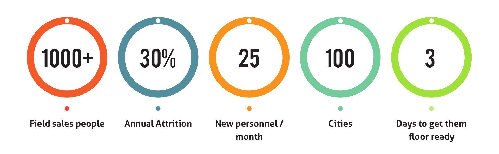 Consumer durable organisations often have sales personnel across multiple geographies. This particular organisation has 1000+ field sales people and has a 30 percent attrition rate.