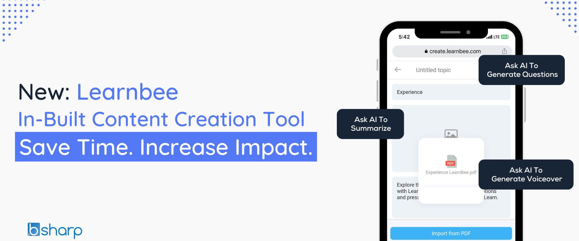 • Reduced content development time: Learnbee’s AI & interface makes it easy to create content by just uploading your training PDF.