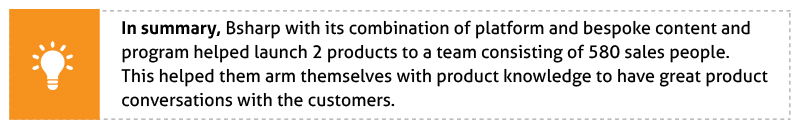 All this content was delivered through Bsharp’s sales enablement platform. Every field sales personnel received a notification on the mobile phones announcing the launch. App, email and SMS notifications also helped nudge the team to complete the training modules. The platform helped drive engagement using app-based discussion sessions which helped connect the corporate to the field team and acted as platform to share customer queries.