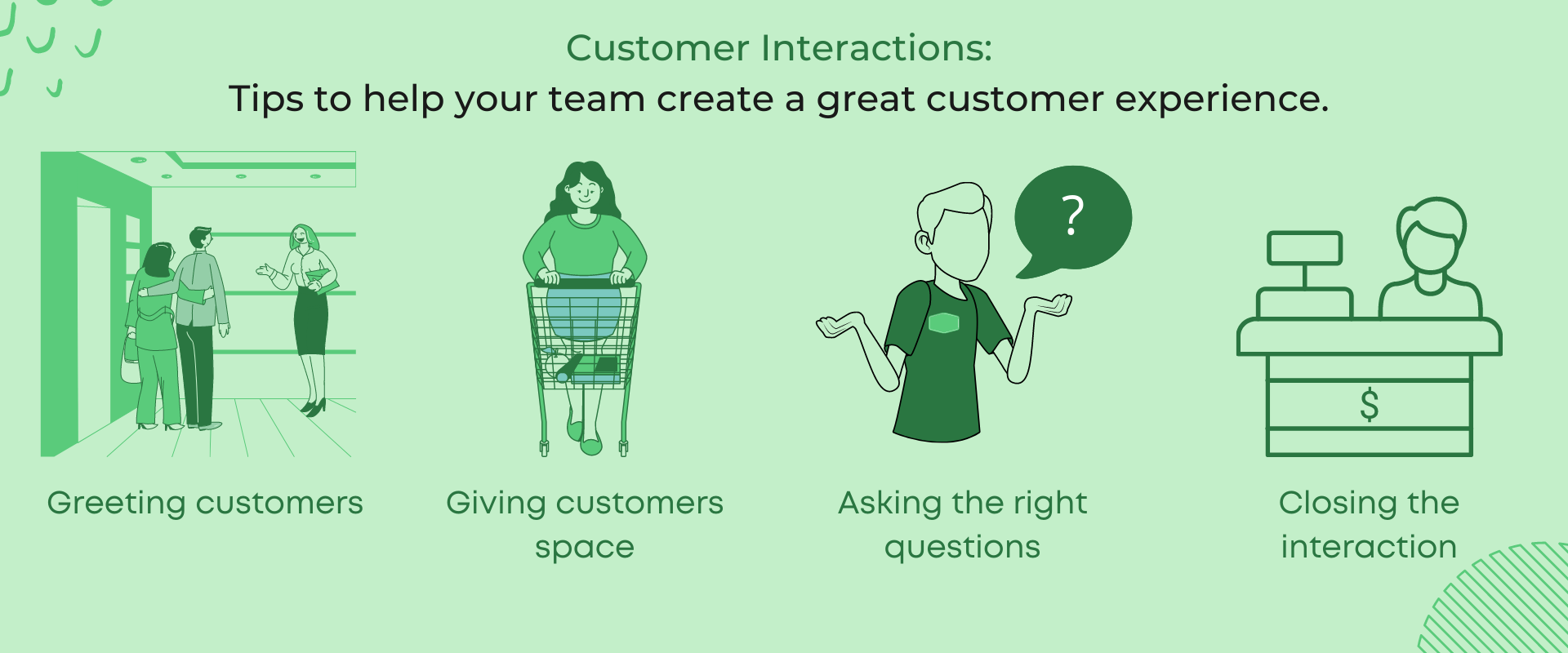 - Giving the customer space: Making sure not to crowd the customer and giving them space to browse on their own.